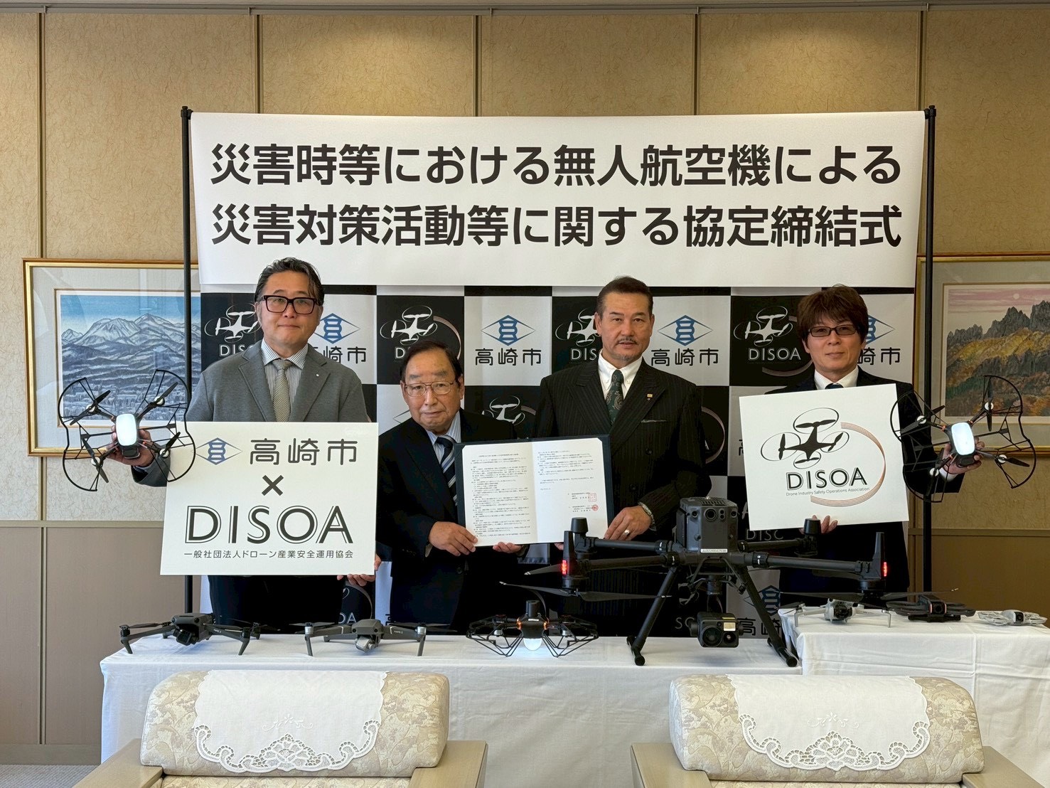 2025年11月19日(水)、高崎市と一般社団法人ドローン産業安全運用協会(DISOA)による「災害時等における無人航空機の活用に関する協定」の締結式が行われました。